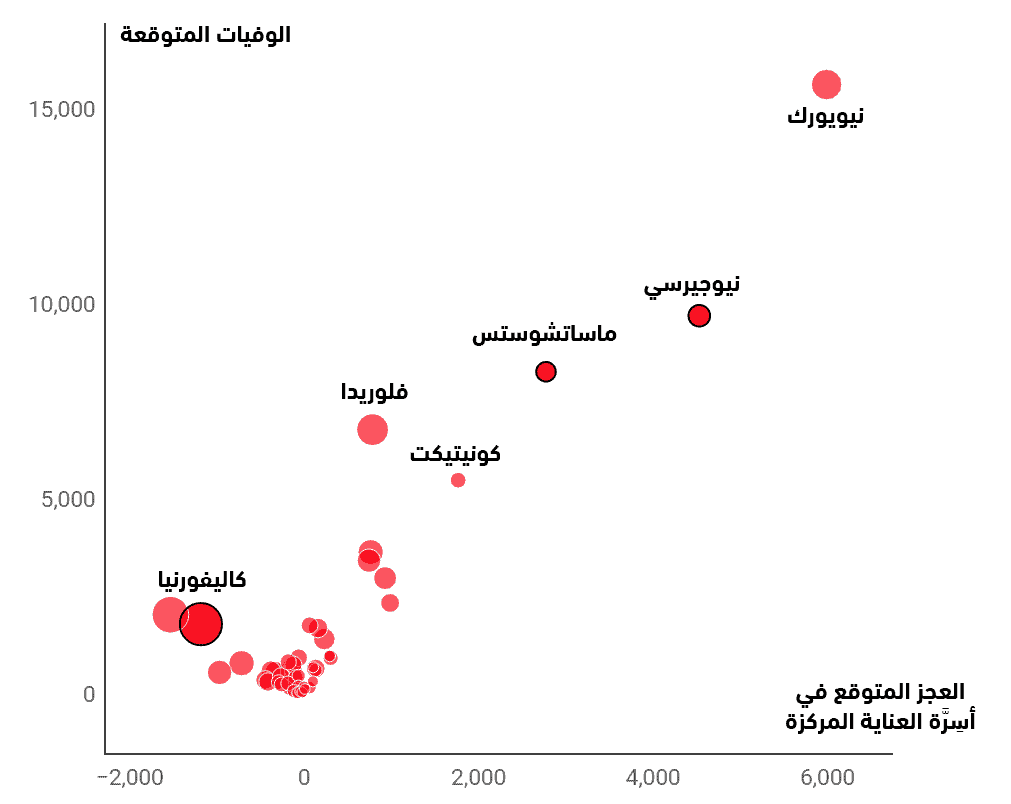 ويتوقع معهد القياسات الصحية والتقييم بجامعة واشنطن عدد الوفيات المرتبطة بمرض كوفيد 19 في كل ولاية، على افتراض أن كلاً منها سيستمر في اتباع سياسة الابتعاد الاجتماعي خلال فترة التنبؤ. ويُظهر الرسم البياني التالي بوضوح كيف سيكون تأثير العجز المتوقع في أسِرَّة العناية المركزة أكبر على الوفيات المتوقعة في الولاية من تأثير إجمالي عدد سكانها؛ فكاليفورنيا مثلاً هي أكبر الولايات من حيث عدد السكان، إلا أن هناك فائضاً متوقعاً في أسِرَّة العناية المركزة بها. وبالتالي فإن عدد الوفيات المتوقع بها أقل بكثير من العدد المتوقع في ولايات مثل ماساتشوستس أو نيوجيرسي، التي لا تحتوي أي منهما إلا على عدد قليل من السكان.