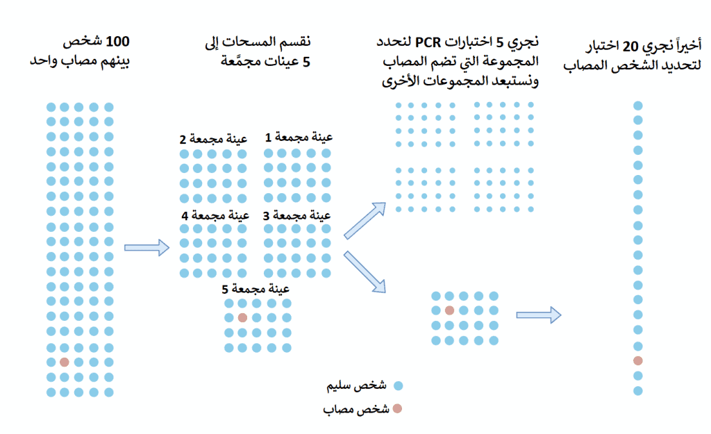 لنفترض أننا نرغب في اختبار الإصابة بفيروس كورونا على 100 شخص. وبعد أخذ المسحات من الجميع، نقسّمهم إلى 5 مجموعات تتألف كلٌّ منها من 20 شخصاً، ثم نُجري اختبار تفاعل البوليميراز المتسلسل على 5 عينات مجمّعة. فإذا كان لدينا شخص واحد مصاب، فإن 4 مجموعات ستكون نتيجتها سلبية وستكون نتيجة المجموعة التي تضم الشخص المصاب إيجابية. في هذه المرحلة نكون قد استبعدنا إصابة 80 شخصاً باستخدام 4 اختبارات فقط. ثم في المرحلة الثانية نجري الاختبار على الأشخاص العشرين في المجموعة الأخيرة حتى نحدد الشخص المصاب. وبذلك نكون قد أجرينا 25 اختباراً عوضاً عن 100 اختبار بتحديد شخص مصاب واحد ضمن مجموعة مكونة من 100 شخص.