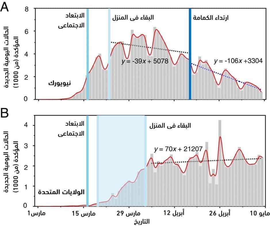 تبين نتائج الدراسة أن إجراءات البقاء في المنزل والابتعاد الاجتماعي لم تحقق فوائد كبيرة في نيويورك (الشكل A)، وأن منحنى الإصابات اليومية قد بدأ ينخفض بعد فرض ارتداء الكمامات. ويقارن الباحثون هذه النتيجة مع الولايات المتحدة (الشكل B) ككل، حيث لم تُفرض فيها سياسة شاملة على مستوى البلاد لارتداء الكمامات.