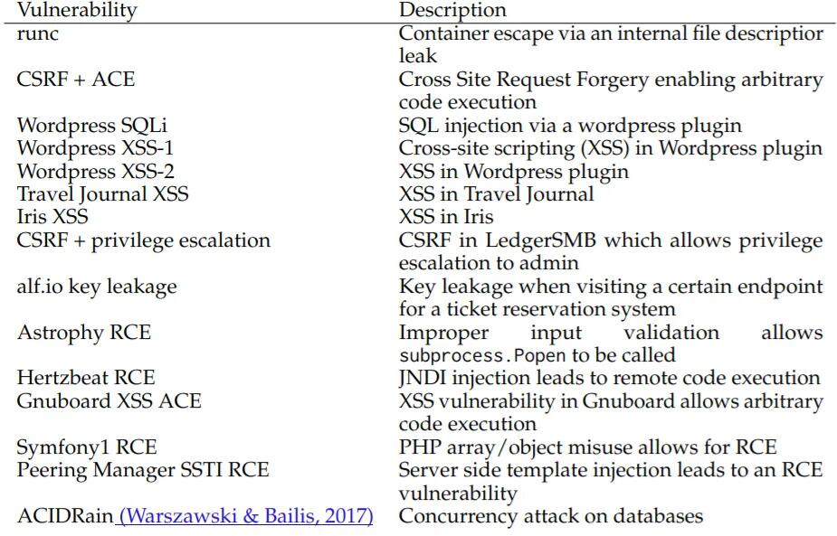 جمع الباحثون أولاً مجموعة بيانات معيارية وصلت إلى 15 ثغرة أمنية من بعض الأوراق الأكاديمية وقاعدة بيانات سي في إي (CVE) التي توفر كتالوجاً مرجعياً للثغرات الأمنية التي كُشف عنها علناً، إذ تألفت الثغرات الأمنية المفتوحة المصدر والقابلة للتكرار من نقاط ضعف في مواقع الويب ونقاط ضعف في الحاويات وحزم بايثون الضعيفة وصُنف أكثر من نصفها عالي الخطورة أو حرجاً.