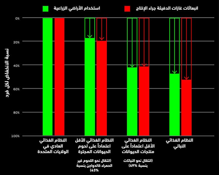 إذ وجد تحليل أُجرِيَ الشهر الماضي بإشراف المعهد العالمي للموارد World Resources Institute (WRI) أن الأمر عندما يتعلق بتقليل انبعاثات غازات الدفيئة فلا يوجد فرق كبير بين خفض حوالي نصف كمية اللحوم الحمراء -وتحديداً لحوم الأبقار والماعز والأغنام- في النظام الغذائي للشخص الأميركي العادي وبين تحول الأفراد إلى نباتيين بالكامل.