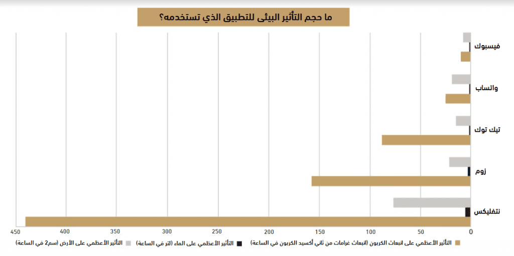 ووجدت الدراسة المنشورة في مجلة (Resources, Conservation & Recycling) أن إجراء مكالمة فيديوية لساعة واحدة تؤدي إلى انبعاث ما بين 150 و1,000 جرام من ثاني أكسيد الكربون، وتستدعي استهلاك ما بين 2 و12 لتراً من الماء وتتطلب استخدام مساحة من الأرض تعادل مساحة جهاز آيباد ميني. وللمقارنة، فإن احتراق لتر واحد من البنزين يؤدي إلى انبعاث 2.3 كيلوجرام من ثاني أكسيد الكربون.