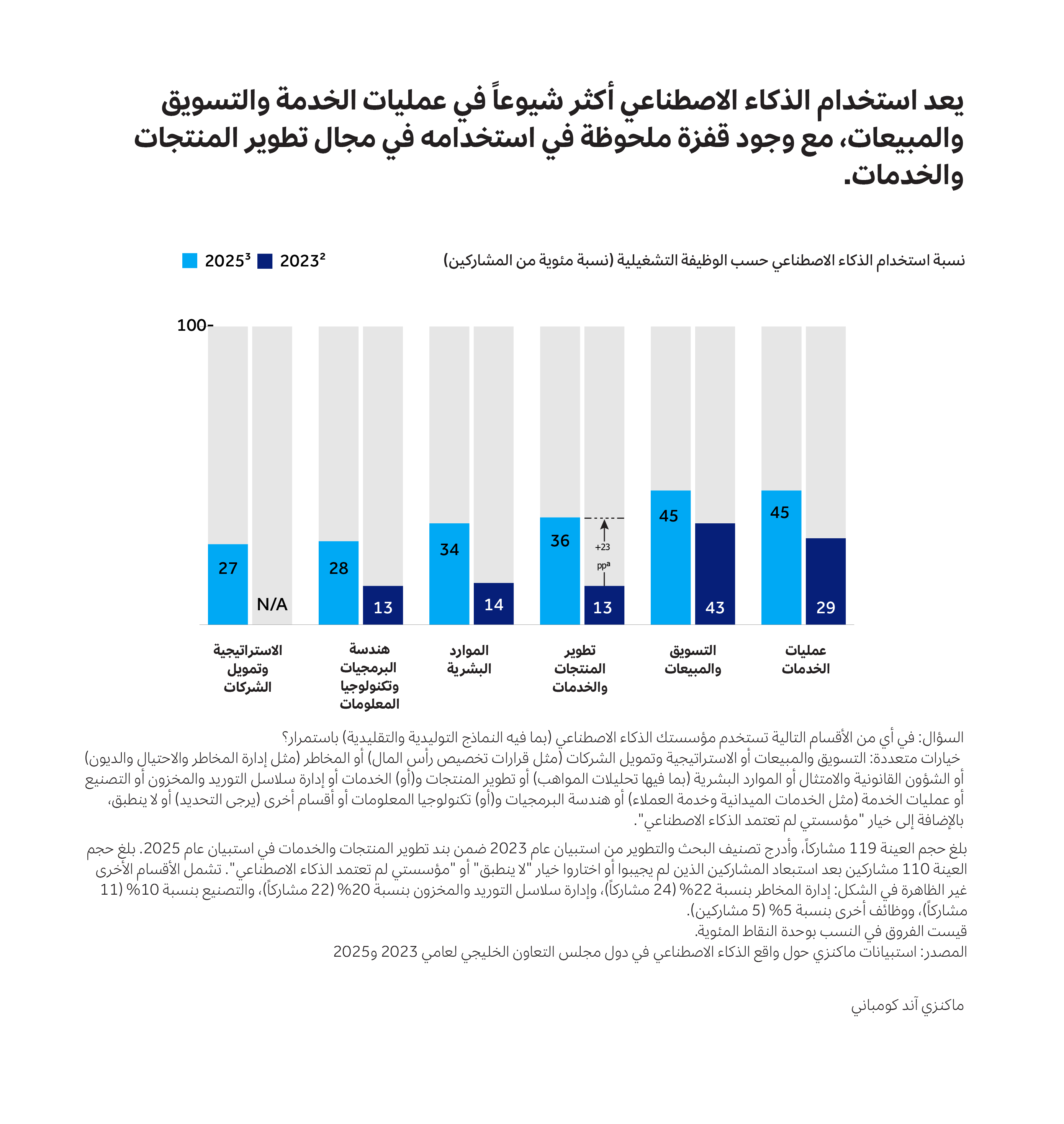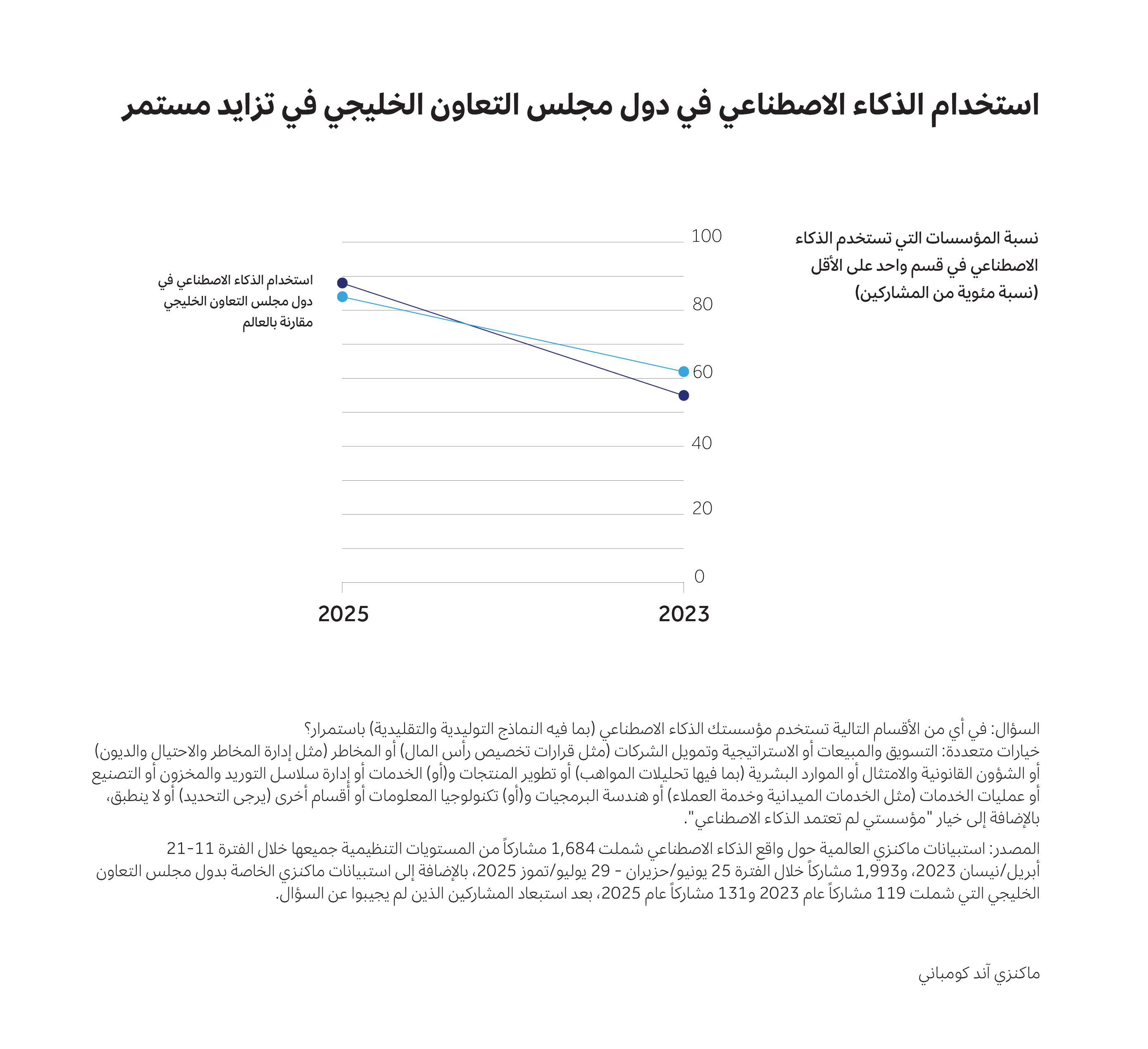 أُجري هذا الاستبيان خلال الفترة من أغسطس/آب إلى سبتمبر/أيلول 2025. وقد سبق إجراء استبيانات مماثلة في عامي 2023 و2024، ما أتاح تقييماً قائماً على البيانات لتطور معدل استخدام الذكاء الاصطناعي في منطقة الخليج. مع ذلك، ركز استبيان 2024 على الذكاء الاصطناعي التوليدي حصرياً، وليس الذكاء الاصطناعي بمفهومه الأوسع، لذا فبعض البيانات غير قابلة للمقارنة. كما تتيح استبيانات عالمية منفصلة أجرتها ماكنزي إمكانية المقارنة ببقية أنحاء العالم.