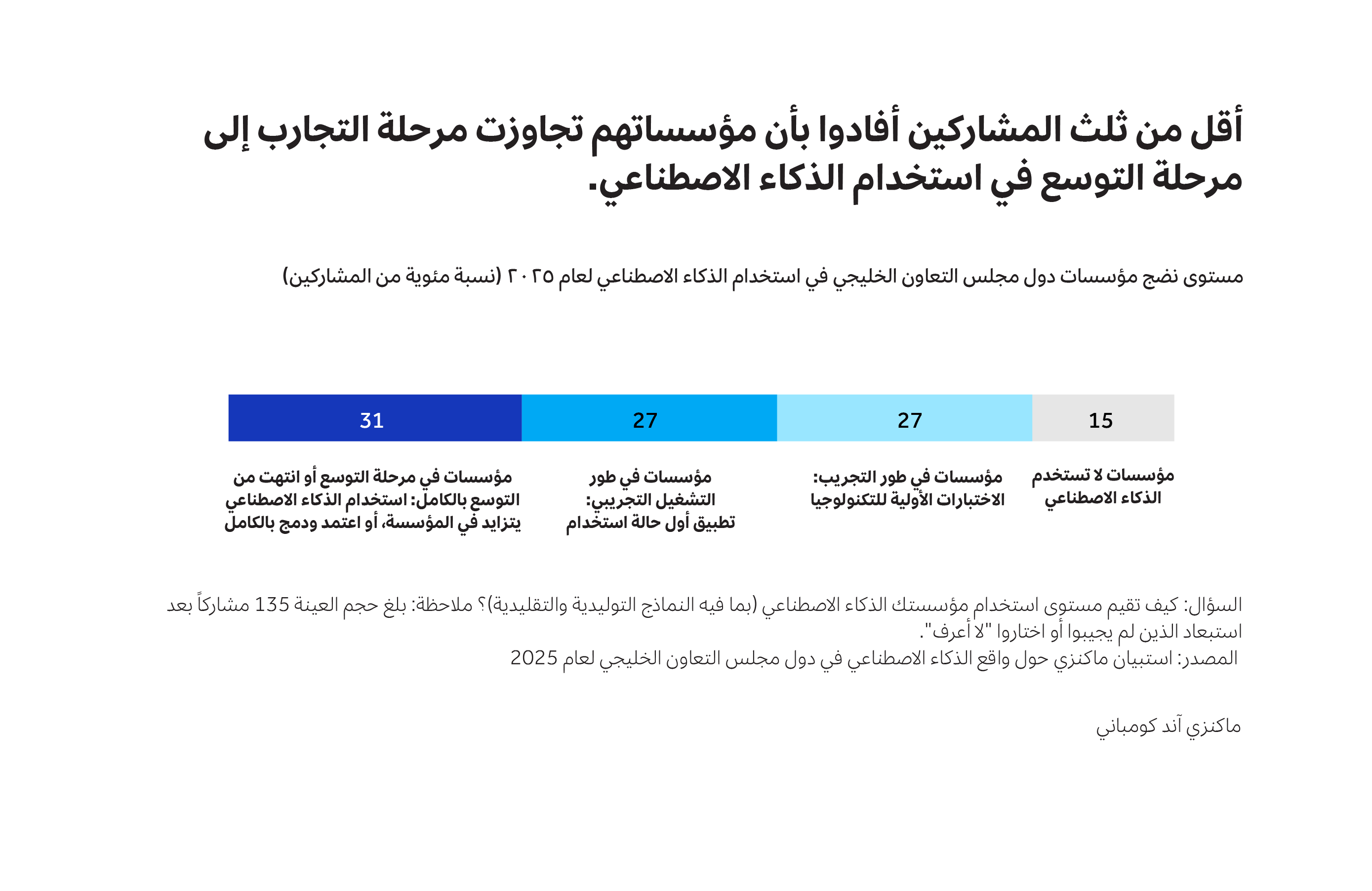 تشير نتائج استبيان "واقع الذكاء الاصطناعي" إلى أن معظم مؤسسات دول الخليج تستخدم هذه التكنولوجيا بالفعل، لكن قلة منها فقط نجحت في التوسع باستخدامها وتحقيق قيمة ملموسة، في حين لا تزال الغالبية العظمى في مرحلة التجارب الأولية.