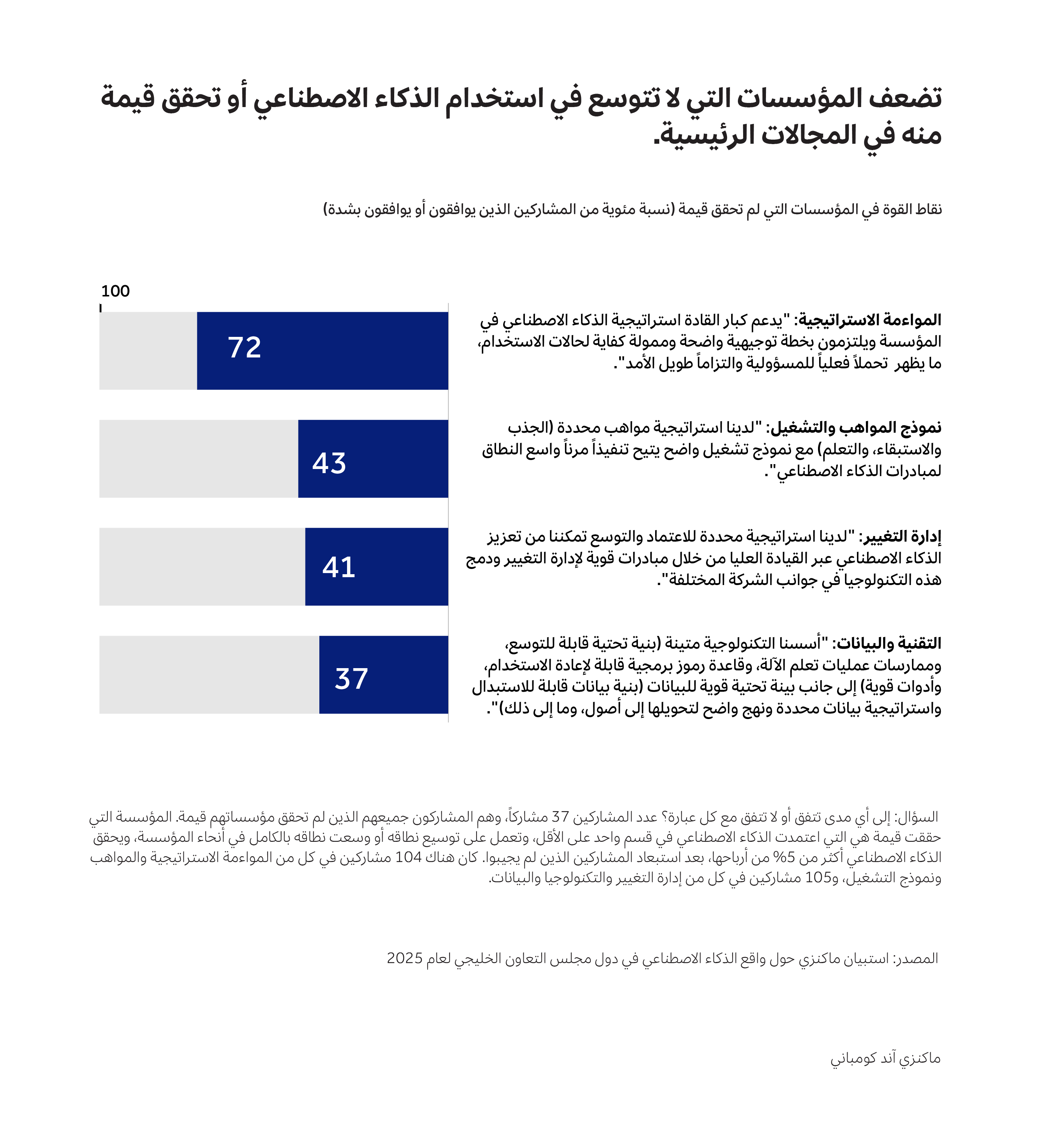 تشير نتائج استبياننا إلى أن معظم المؤسسات قد وفقت بين استراتيجيتها واستراتيجية الذكاء الاصطناعي، وحظيت بدعم قوي من القيادة، لكن قلة قليلة منها امتلكت القدرات اللازمة لتحويل هذه النوايا الاستراتيجية إلى أثر ملموس.
