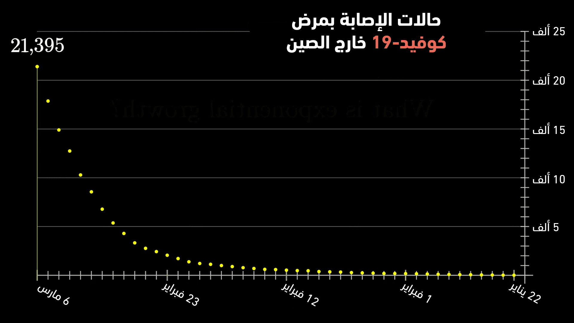 يمثل المنحنى السابق تزايد عدد الإصابات بالفيروس خارج الصين من الفترة الزمنية الممتدة من 22 يناير وحتى 6 مارس، ويمكن بشكلٍ سريع ملاحظة أنه وحتى تاريخ 23 فبراير كان هنالك تزايد بطيء بعدد الإصابات ومن ثم أصبح الإصابات بتزايدٍ أسيّ كبير، وهكذا فإنه يمكن استخدام معادلة النمو الأسيّ لفهم كيفية انتشار فيروس كورونا، وكذلك من أجل فهم عدد الإصابات المحتمل عند يومٍ محدد. لو عدنا لمعادلة النمو الأسيّ فإن ما يهمنا معرفته هو معدل النمو الخاص بالفيروس وما هي العوامل المرتبطة به والتي ستكون عاملين فقط – من باب التبسيط. هذه العوامل هي المعدل الوسطي للأشخاص الذين سيقابلهم شخص مصاب بالفيروس في كل يوم ولنسمي هذا العامل الرمز E، واحتمالية أن يؤدي كل تعرّض لحدوث إصابة، ولنسمي هذا العامل بالرمز p. وبالتالي ومن أجل توقع عدد الأشخاص المصابين بفيروس كورونا بيومٍ ما، يمكننا استخدام معادلة النمو الأسيّ كما يلي: