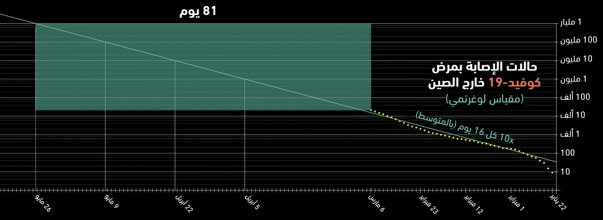 الآن لنفترض أن معدل النمو الحاليّ سيبقى على حاله، ولنحاول حساب عدد الإصابات المحتملة خارج الصين آخذين بعين الاعتبار 6 مارس كتاريخ للبداية، وعند استخدام معادلة النمو الأسيّ وإدخال كافة المعلومات المتوفرة حول الفيروس بهذا التاريخ، فإن أول ما سنلاحظه هو أن عدد الإصابات سيتزايد بمعدل 10 مرات كل 16 يوماً، وبالتالي وبدءاً من عدد إصابات بحدود 21 ألف إصابة بتاريخ 6 مارس، فإن عدد الإصابات الكليّ سيصل للمليون بعد 30 يوم، وسيصبح 10 مليون إصابة خلال 47 يوماً، وسيصبح 100 مليون خلال 64 يوماً وأخيراً سيصبح مليار إصابة خلال 81 يوماً، أي بتاريخ 26 مايو. الشكل التالي يظهر تزايد عدد الإصابات مع مرور الوقت ولكن بعد تحويله للتمثيل اللوغاريتمي: