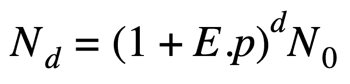 يمثل الرمز Nd عدد الأشخاص المصابين بفيروس كورونا في اليوم d، ويمثل الرمز N0 عدد الأشخاص المصابين بالفيروس عند بدء التوقع، وبهذه الحالة لنفترض أنه 6 مارس، وهذا يعني أن عدد الإصابات خارج الصين هو 21395 إصابة. أخيراً يمثل الجداء E.p معدل النمو، والذي سيتم اعتباره مساوياً للقيمة 1.15، وهي تساوي تقريباً قيمة معدل النمو الحقيقي الخاصة بالفيروس.