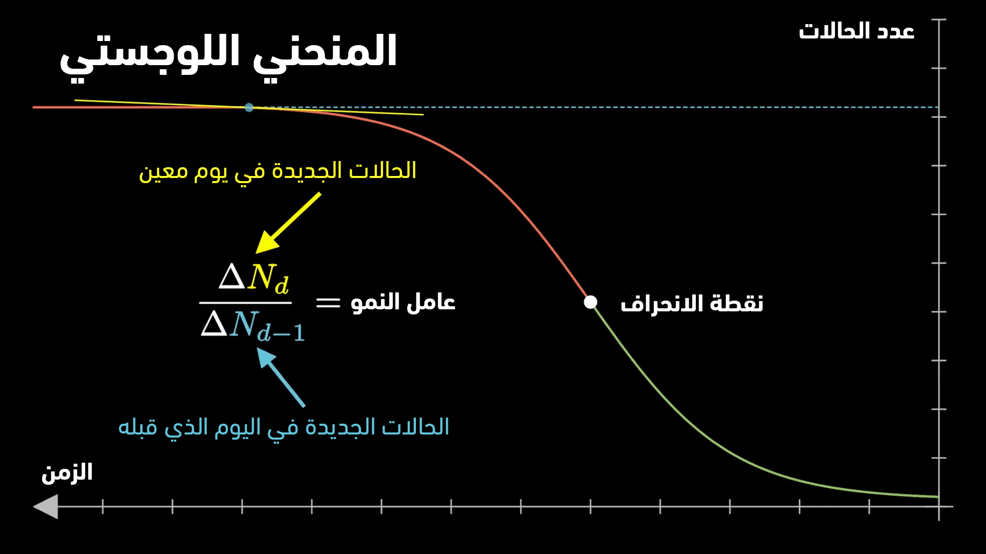 تعتبر الأرقام السابقة مفزعة إلى حدٍ ما، وهي تأخذ بعين الاعتبار بقاء معدل النمو على شكله الحالي، وإذا تزايد معدل النمو فإنها ستصبح أسوأ بكل تأكيد. لو أردنا الحديث بشكلٍ واقعيّ، فإن تزايد عدد الإصابات سيتبع على الأغلب نموذج النمو اللوجستي، أي أنه بيومٍ ما لن تتزايد أعداد الإصابات وستستقر عند قيمةٍ محددة. هذا الأمر يتبع لمعدل النمو، فطالما أنه ثابت أو متزايد ستزداد الإصابات بشكلٍ متواصل وبلا توقف، ولكن ومع تناقص معدل النمو وبلوغه قيمة 1.00، سيصل المنحني الخاص بتزايد معدل الإصابات القيمة المعروفة باسم نقطة التحول (Inflection Point) التي تمثل بدء مرحلةٍ جديدة يستمر معها معدل النمو بالتناقص حتى الوصول لقيمة الاستقرار المعروفة باسم سعة الحمل، والتي تشير إلى القيمة التي لن يتزايد بعدها عدد الإصابات. الشكل التالي يوضح تزايد عدد الإصابات تبعاً لنموذج المنحني اللوجستي: