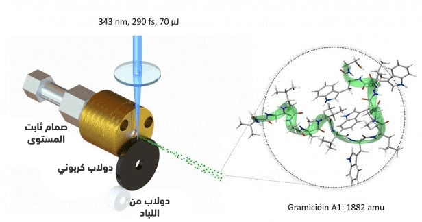 وقد تمكن شاييجي وزملاؤه من تحقيق هذا بتغطية حافة دولاب دوار بطبقة رقيقة من الجراميسيدين، ومن ثم إطلاق سلسلة من النبضات الليزرية السريعة على الدولاب لقذف جزيئات الجراميسيدين عن السطح. ويجب أن تكون هذه النبضات قصيرة بما يكفي -لا تتجاوز طولها بضعة فمتو ثانية- لضرب الجزيئات وإبعادها عن السطح دون إيذائها.