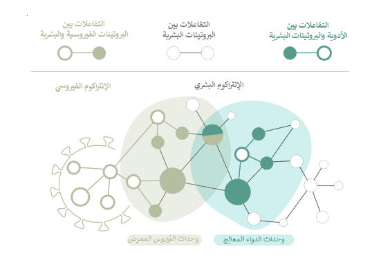 يركز النموذج ليس فقط على الأدوية التي يمكن أن تحارب الفيروس بتعطيل بروتينات الشوكة، وإنما أيضاً على الأدوية التي تعطِّل التفاعلات الأخرى بين البروتينات والجينات البشرية. وتستهدف هذه الأدوية مناطق داخل الخلية حيث يعمل الفيروس، عوضاً عن استهداف الفيروس بشكل مباشر. وبكلمات أخرى، تستهدف هذه الأدوية التأثير على طريقة ترميز البروتينات التي يحتاجها فيروس كورونا حتى يمارس نشاطه.