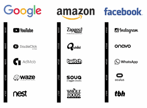 غير أن فيسبوك ليست الشركة الوحيدة المستهدفة. ففي وقت سابق من هذه السنة، قالت لينا خان -الباحثة في معهد أوبين ماركتس، وهو أحد المنظمات التي تقف خلف الحملة على فيسبوك- في بحث منشور أن شركة أمازون بلغت حداً كبيراً من السيطرة على التجارة الإلكترونية، ولهذا يجب أن تخضع لإعادة هيكلة حكومية، وأن تُجبر على الاختيار ما بين التخصص ببيع السلع نفسها أو الاكتفاء بإدارة المنصة الإلكترونية التي تستخدمها ويستخدمها تجار الإنترنت الآخرين للوصول إلى الزبائن. وإذا اختارت أن تكون منصة وحسب، يجب أن تتخلى عن عدة شركات تابعة لها، مثل سلسلة سوبرماركت هول فودز الأميركية التي اشترتها العام الماضي.