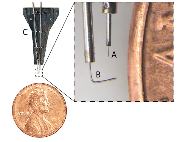 تريد نيورالينك حل هذه المشاكل دفعة واحدة: أولاً، يتألف نظام التحسس الخاص بنيورالينك من عددٍ كبيرٍ جداً من الحساسات، البالغ 3072 حساساً مقسمة على 96 مسلك (Thread)، بحيث يتضمن كل مسلك 32 حساساً. ثانياً، تبلغ سماكة المسلك الواحد الذي يربط من 4 وحتى 6 ميكرومتر، أي أنحف من الشعرة العادية، وهكذا ستكون تقنية نيورالينك قادرة على زرع عدد كبير من وحدات التحسس في الدماغ، وعند أبعادٍ صغيرة جداً تجعلها قادرة على تحسس الإشارات الكهربائية الخارجة من العصبونات بدقةٍ عالية جداً، ودون أي مخاوف صحية؛ كون هذه المسالك لن تمر على الإطلاق في الأوعية الدموية. وبالمقارنة، فإن نظام برين جيت الشهير يعتمد على مصفوفة إلكترودات تدعى مصفوفة يوتاه (Utah Array) التي تتضمن 92 إلكترود، وهو أقل بكثير من نظام نيورالينك الذي يتضمن 3072 إلكترود. بهذا الشكل، ومع عددٍ كبير من الإلكترودات المزروعة ضمن الدماغ نفسه، سيتم تجاوز العديد من المشاكل المرتبطة بالضجيج وتشوه الإشارات وعدم القدرة على تسجيل نشاط منطقة معينة في الدماغ بدقة ووثوقية.