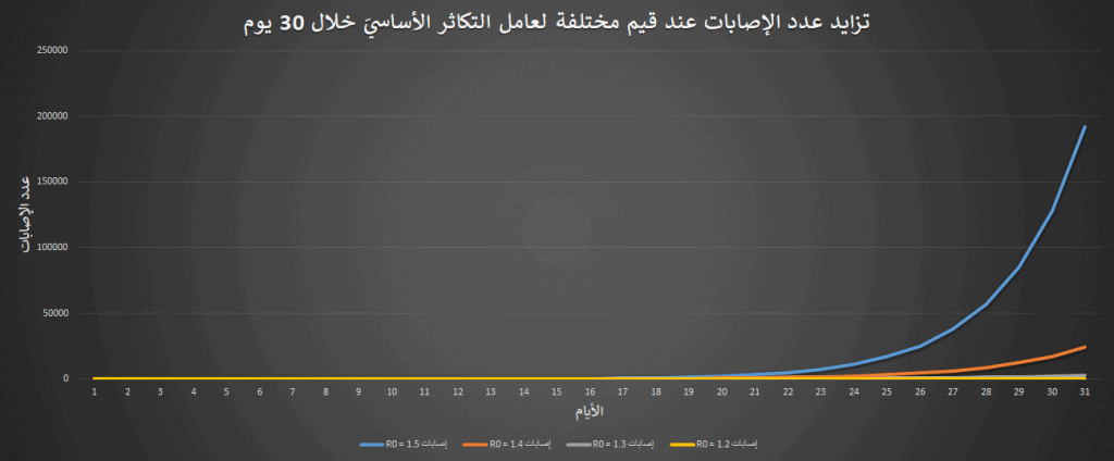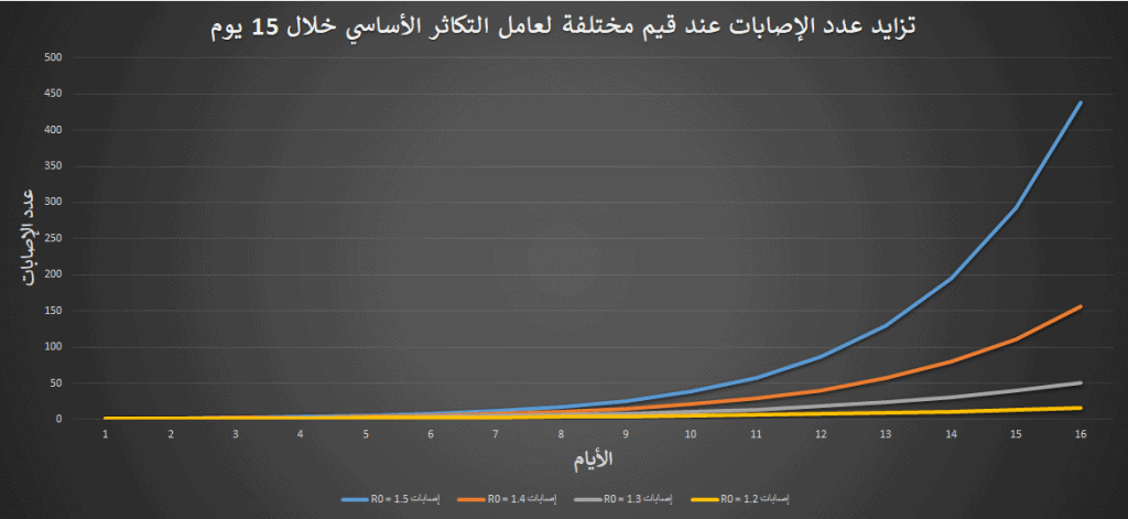 سيبدو انتشار المرض عند هذا الحد ضعيفاً، ولكن بمتابعة الحسابات سنجد أن الأرقام بهذه الحالة ستأخذ منحى تصاعدياً كبيراً بعد اليوم العاشر، وستصل عدد الإصابات إلى ألف إصابة خلال 17 يوماً، ومن ثم ستصل لحدود المليون بعد 34 يوماً فقط. فكيف ستكون عليه الأمور لو أن قيمة عامل التكاثر هي 1.4؟ هل سيؤدي ذلك لاختلافاتٍ كبيرة؟ نعم، وأكثر مما نتصور، وإن كانت 1.3 فسيكون هنالك تغيرات مذهلة في سرعة انتشار المرض، وإن كانت 1.2 فإن الفروقات بين سرعة الانتشار مع الحالة الأولى (أي عندما كانت قيمة عامل التكاثر 1.5) ستصبح شاسعة للغاية. المنحنيات البيانية التالية تظهر أثر تغير عامل التكاثر الأساسيّ على انتشار المرض بين السكان خلال فترةٍ زمنية قدرها 15 يوماً: