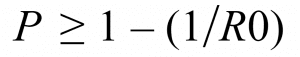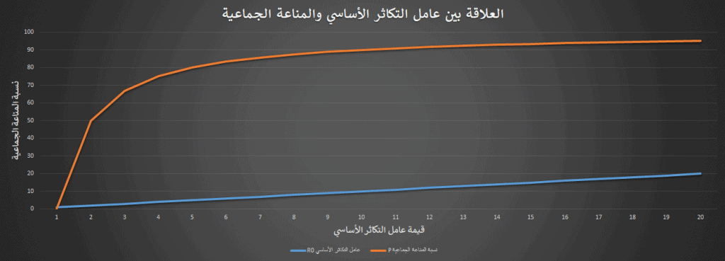 يمثل الرمز P نسبة الأشخاص الواجب امتلاكهم لمناعةٍ ضد المرض، لضمان عدم قدرة الفيروس على الانتشار بشكلٍ فعالٍ ضمن المجتمع وإحداث وباءٍ صحي. عبر معرفة قيمة R0 يمكن بسهولة تحديد قيمة P؛ لو افترضنا أن عامل التكاثر الأساسيّ R0 = 2، فهذا يعني أن نسبة الأشخاص الذين يمتلكون مناعةً ضد المرض يجب أن تكون 50%، وإذا كانت قيمة عامل التكاثر الأساسيّ R0 = 5 (كما هي عليه ببعض المناطق والبؤر) فهذا يعني أن نسبة الأشخاص الواجب امتلاكهم لمناعةٍ ضده يجب أن تكون 80%. إذا ازدادت قيمة R0 لتصبح 10، فهذا يعني أن نسبة الأشخاص المنيعين يجب أن تبلغ 90%. المخطط التالي يُظهر العلاقة بين قيمة عامل التكاثر الأساسيّ ونسبة المناعة الجماعية المطلوبة في المجتمع لمنع تحوله لوباءٍ وأزمة صحية واسعة الانتشار: