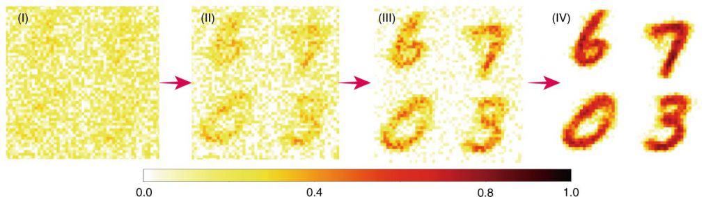 تبين الخطوة الأولى أوزان الوصلات العصبونية في المراحل الأولى من التعلم، وتبين الخطوتان 2 و3 الأوزان بعد التعلم من 10,000 و 30,000 صورة تدريبية، أما الخطوة الرابعة فتبين الأوزان النهائية التي تم تعلمها بعد 60,000 صورة تدريبية.