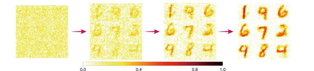 تبين الخطوة الأولى أوزان الوصلات العصبونية في المراحل الأولى من التعلم، وتبين الخطوتان 2 و3 الأوزان بعد التعلم من 10,000 و 30,000 صورة تدريبية، أما الخطوة الرابعة فتبين الأوزان النهائية التي تم تعلمها بعد 60,000 صورة تدريبية.