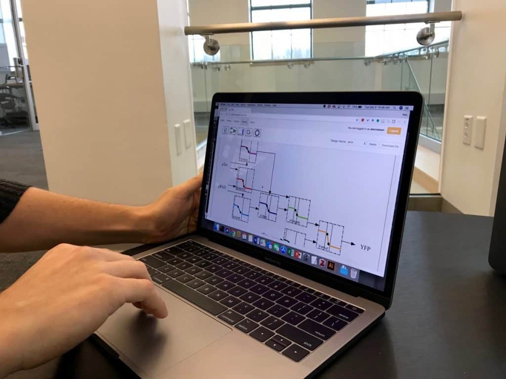 يجلس أليك نيلسن في المكان المخصّص للمختبر في شركته الناشئة على مشارف الحرم الجامعي لمعهد ماساتشوستس للتكنولوجيا، ويفتح كمبيوتره المحمول ويبدأ بكتابة التعليمات لإحدى خلايا الخميرة المعدّلة وراثياً والتي من شأنها أن تتوّهج بلون أصفر. إذ يقوم بإبلاغ البرنامج عن نوع السكريات التي ينوي تغذية الخلية بها - وهي أرابينوز ولاكتوز - ويحدّد بأن ذلك من شأنه أن ينتج بروتيناً متألقاً يتواجد عادة عند قنديل البحر.