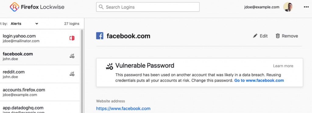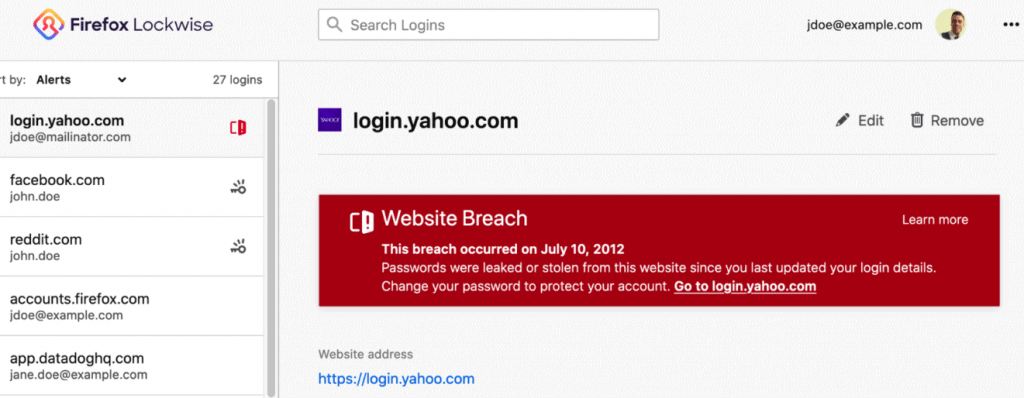 وفي خطوة من موزيلا لتجنب هذا النوع من الاختراق، يقوم الإصدار الجديد من فايرفوكس بتنبيهك حول حدوث تسريب لكلمات المرور من أحد المواقع التي تسجل الدخول إليها. كما يعرض تحذيراً إذا ما قمت باستخدام كلمة المرور الخاصة بأحد هذه المواقع المخترقة في تسجيل الدخول إلى موقع آخر ويدعوك إلى تغييرها.