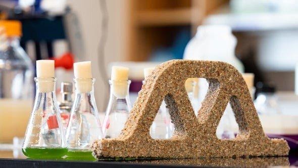 استخدم باحثون من جامعة كولورادو بولدر نوعاً من أنواع البكتيريا قادراً على امتصاص ثاني أكسيد الكربون وضوء الشمس والمغذيات لإنتاج كربونات الكالسيوم، وهو مركب صلب موجود في الصخور واللؤلؤ وصدف البحر؛ حيث قام العلماء بزراعة البكتيريا ضمن مزيج دافئ من الماء المالح والمواد المغذية الأخرى وخلطها مع الرمل والجيلاتين، ثم قاموا بسكب الخليط في قالب، وبتكثّف الجيلاتين تمّ تكوين "سقالة" قادرة على دعم نمو البكتيريا. وبعد ذلك، قامت البكتيريا بترسيب كربونات الكالسيوم في داخل السقالة، محوّلةً بذلك الرمل الناعم إلى مادة صلبة بعد يوم واحد تقريباً. ويبدو الخليط أخضرَ في البداية، ثم يتلاشى اللون عند جفافه. وقد تم نشر البحث في مجلة ماتر، وتم تمويله من قِبل وكالة المشاريع البحثية الدفاعية المتقدمة، وهو الفرع البحثي للجيش الأمريكي.