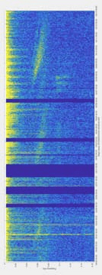 صورة تم تكوينها من قِبل الدكتور زونجوين زان من مختبر البحوث والدراسات الزلزالية في معهد كاليفورنيا للتكنولوجيا بناء على بيانات جوجل، حيث يمثل المحور X التردد من 0 إلى 0.16 هرتز، بينما يمثل المحور Y الزمن. وتبدو أمواج المحيط كخطوط صفراء مائلة مشوشة.