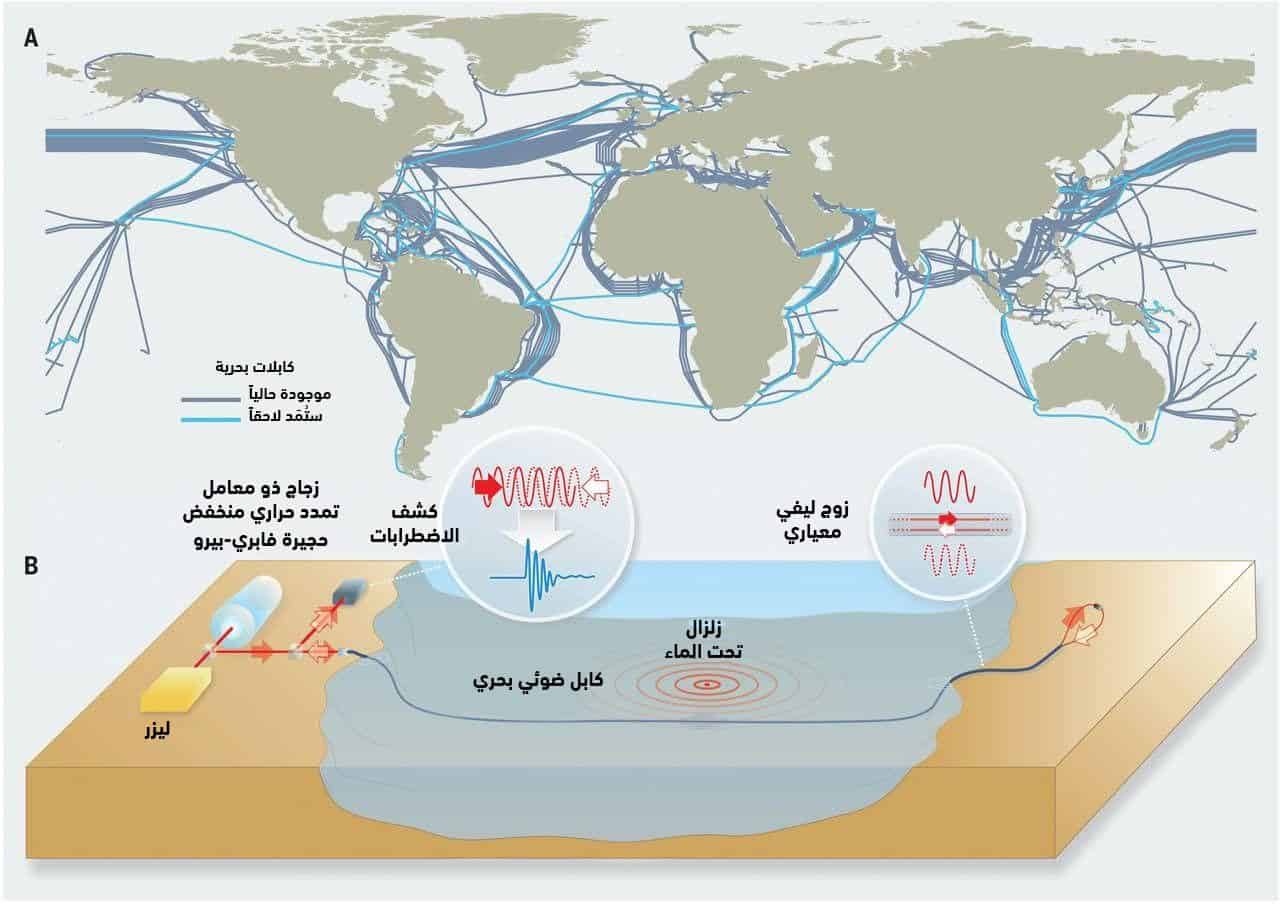 A- شكل توضيحي يبين البنى التحتية للاتصالات البحرية، سواء الموجودة حالياً أو التي ستُبنى لاحقاً. وتتيح أساليب القياس للترددات الضوئية استخدام وصلات الألياف لكشف الزلازل في قيعان البحار والمحيطات. حقوق الملكية لبيانات الخريطة محفوظة للمساهمين في OpenStreetMap، وبيانات الكابلات من شركة تيليكوم ريسورسز التابعة لشركة تيليجيوغرافي، وتخضع لحقوق المشاع الإبداعي ShareAlike.