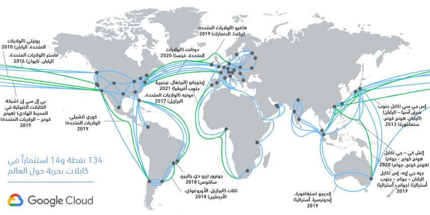 تمتلك جوجل 14 كابلاً بحرياً كبيراً، يبلغ طولها مجتمعة 112,000 كيلومتر تحت المحيط، وتُعد جوجل أكبر مزود لهذا النوع من البنى التحتية في العالم. وإضافة إلى الاتصالات، يمكن استخدام هذه الكابلات لغرض آخر غير متوقع، وهو: التنبؤ بالزلازل.
