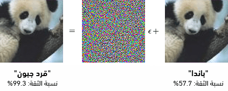 هذه هي نقطة قوة نماذج التعلم العميق، لكن لا تنسَ أن لديها نقطة ضعف أيضاً؛ إذ إن نُظم التعرف على الصور يسهل خداعها من خلال التلاعب بأنماط البكسل بشكل يجعل النظام يرى شيئاً آخر تماماً، وذلك لأنها تعتمد فقط على الأنماط البكسلية بدل اعتمادها على مستوى أعمق من "الفهم التصوري" لِما تراه. وهنا سنتناول مثالاً تقليدياً على ذلك: يكفي أن تضيف قليلاً من التشويش لصورة تمثل "باندا"، وسيقوم نظام التعرّف على الصور بتصنيفها على أنه "جِبون gibbon" (نوع من القرود) بنسبة ثقة تقارب 100%! وهذا "التشويش" يسميه الباحثون في المجال: "هجوماً مُربكاً adversarial attack".