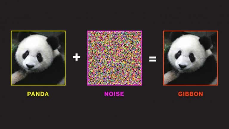 هذه هي نقطة قوة نماذج التعلم العميق، لكن لا تنسَ أن لديها نقطة ضعف أيضاً؛ إذ إن نُظم التعرف على الصور يسهل خداعها من خلال التلاعب بأنماط البكسل بشكل يجعل النظام يرى شيئاً آخر تماماً، وذلك لأنها تعتمد فقط على الأنماط البكسلية بدل اعتمادها على مستوى أعمق من "الفهم التصوري" لِما تراه. وهنا سنتناول مثالاً تقليدياً على ذلك: يكفي أن تضيف قليلاً من التشويش لصورة تمثل "باندا"، وسيقوم نظام التعرّف على الصور بتصنيفها على أنه "جِبون gibbon" (نوع من القرود) بنسبة ثقة تقارب 100%! وهذا "التشويش" يسميه الباحثون في المجال: "هجوماً مُربكاً adversarial attack".