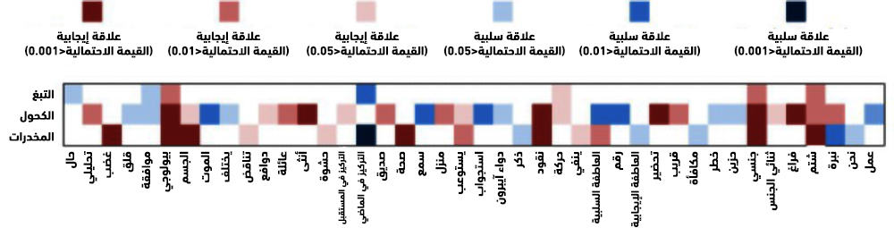 كما حدّدت التقنية أيضاً مجموعة واسعة من الكلمات الرئيسية الأكثر احتمالاً لأن يستخدمها الأشخاص الذين يعانون من اضطرابات تعاطي المواد الإدمانية في منشورات التواصل الاجتماعي. ويقول بيكل وزملاؤه في إشارة إلى تعاطي التبغ والكحول والمخدرات: "هناك علاقة إيجابية بين الأنواع الثلاثة لاضطراب تعاطي المواد الإدمانية وكلمات الشتم مثل اللعنة ويا للقرف، والكلمات الجنسية مثل الإثارة الجنسية والجماع، والكلمات المتعلقة بالعمليات البيولوجية مثل الدم والألم. بالإضافة إلى ذلك، فإن تعاطي الكحول يرتبط ارتباطاً إيجابياً بالإشارات الأنثوية مثل الفتاة والمرأة وحروف الجر وكلمات الإشارة إلى المكان مثل أعلى وأسفل، في حين يرتبط تعاطي المخدرات ارتباطاً إيجابياً بالكلمات المرتبطة بالغضب مثل الكراهية والقتل والكلمات المرتبطة بالصحة مثل العيادة والحبوب."