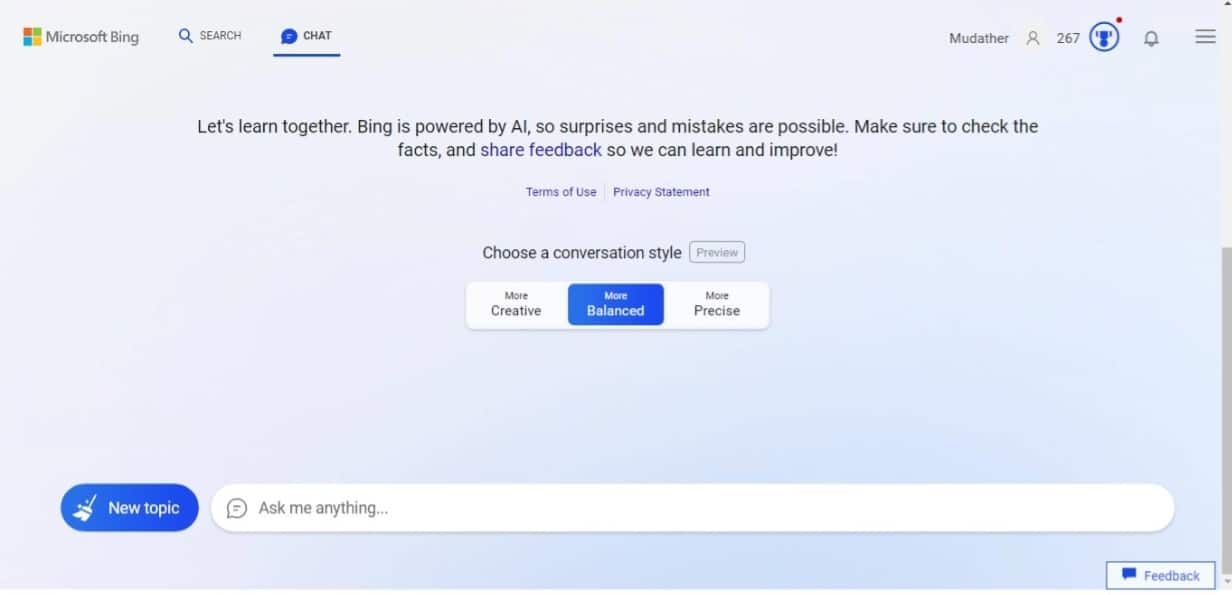 كما يمكنك استخدام رمز الممحاة بجوار حقل إدخال النص لتنظيف القائمة والبدء بالاستفسار من جديد، بالإضافة إلى ذلك يمكنك الضغط على زر توقف عن الاستجابة (Stop Responding) لإيقاف عملية إنشاء الإجابات عن استفسارك في أي وقت، كما يمكن تغيير أسلوب الدردشة والاختيار ما بين إبداعي (Creative) ومتوازن (Balanced) ودقيق (Precise)، حيث يظهر كل منها بلون مختلف ويقدم إجابات بحسب الأسلوب الذي تم الاستفسار عنه.