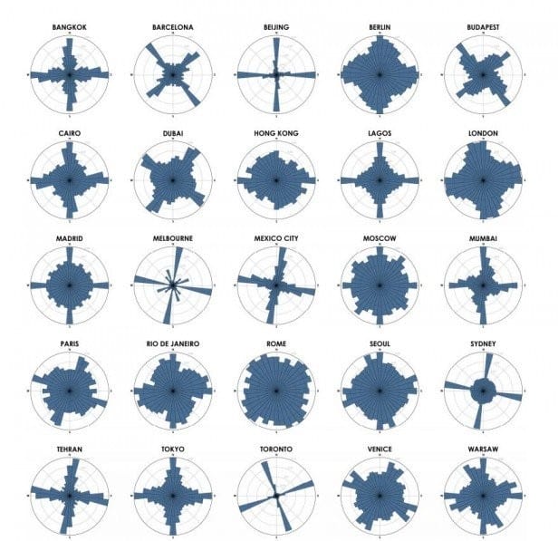 كما استخدم بوينغ مخططات التدرج التكراري القطبية (Polar Histograms)، التي تعرف أيضاً باسم مخططات الوردة؛ وذلك لتوضيح أعداد شوارع المدينة التي تتجه إلى اتجاه معين، وهو ما يمكن أن يكشف على الفور مدى اتباع المدينة لبنية شبكية أو توجهات أكثر عشوائية.