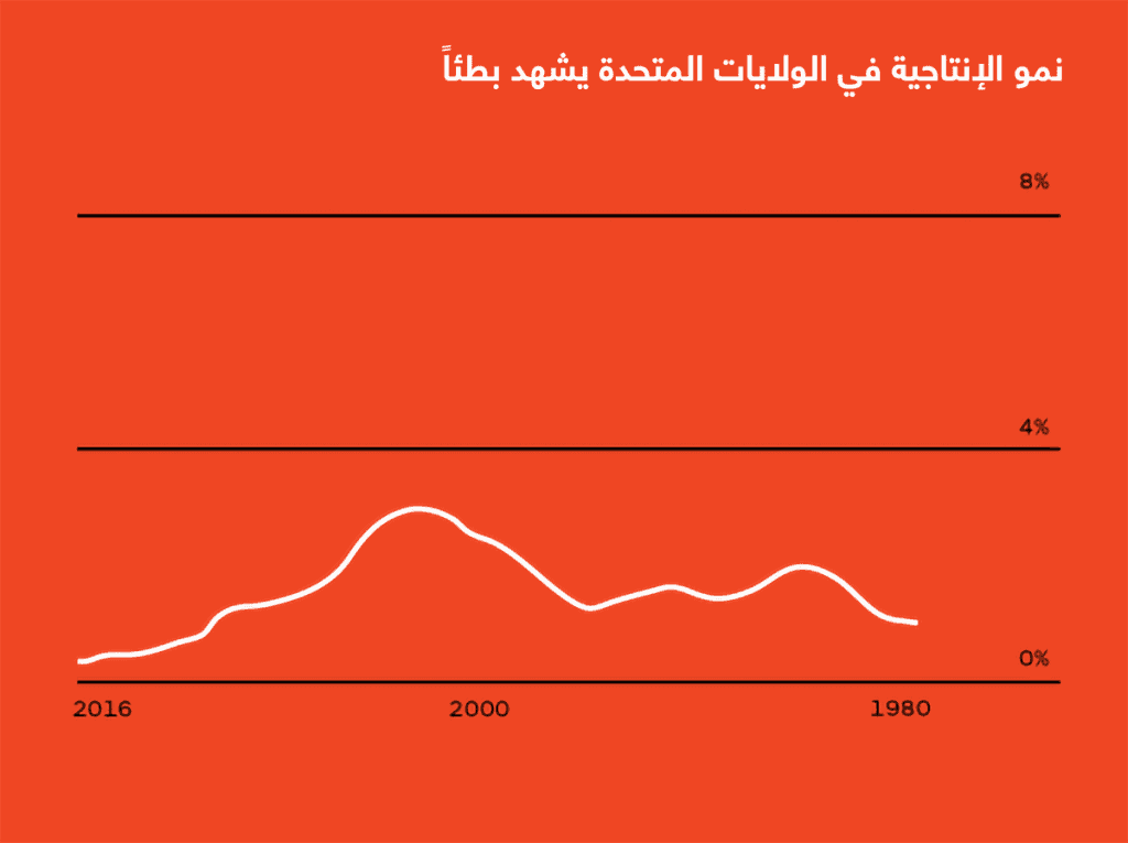 شهدت معظم الدول الغنية في العالم نمواً ضعيفاً في الإنتاجية منذ حوالي عام 2004. لكن الأمر المزعج تحديداً هو الوتيرة البطيئة لما يسميه الاقتصاديون الإنتاجية الإجمالية لعوامل الإنتاج — الجزء الذي يبين مساهمات الابتكار والتكنولوجيا. كيف يمكن في عصر فيسبوك، والهواتف الذكية، والسيارات ذاتية القيادة، وأجهزة الكمبيوتر التي تستطيع التغلب على شخص في أي لعبة من ألعاب اللوحات، أن يكون المقياس الاقتصادي الرئيسي للتقدم التكنولوجي ضعيفاً بهذا الشكل؟ قد أطلق الاقتصاديون على هذه الظاهرة اسم "مفارقة الإنتاجية".