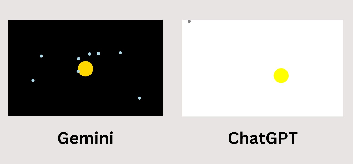 في حين كانت الصفحة التي أنشأها تشات جي بي تي بعيدة عن الواقع، حيث تظهر خلفية بيضاء وفي وسطها دائرة تمثّل الشمس ودائرة واحدة ثابتة بعيدة عن الشمس تمثّل كوكباً واحداً.
