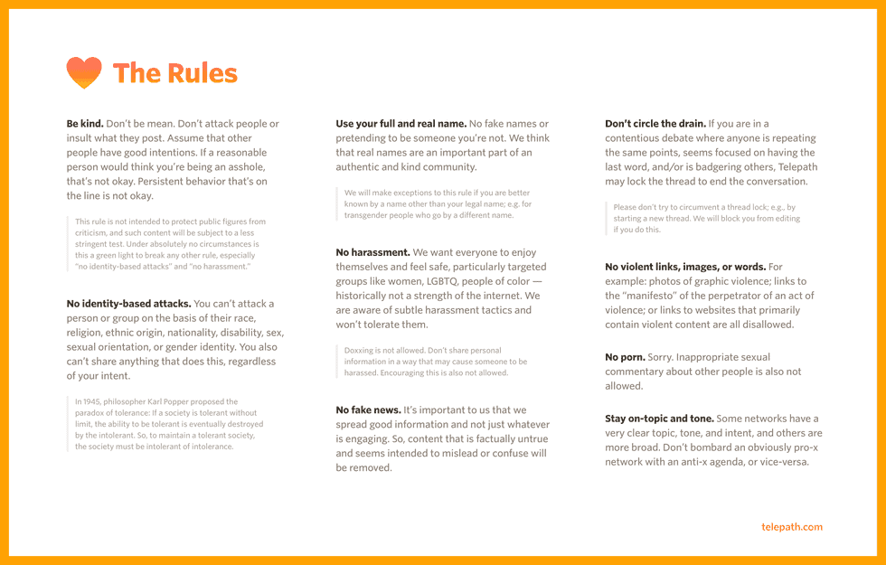 قد لا يبدو هذا مثيراً للاهتمام إلى هذه الدرجة، غير أن النقطة التي تركز عليها تيليباث لتسويق نفسها هي وجود فريق لمراقبة المحتوى ضمن المنصة، ويقوم هذا الفريق بفرض طابع اللطافة على الجميع، كما أن المستخدمين ملزمون بعرض أسمائهم الحقيقية.