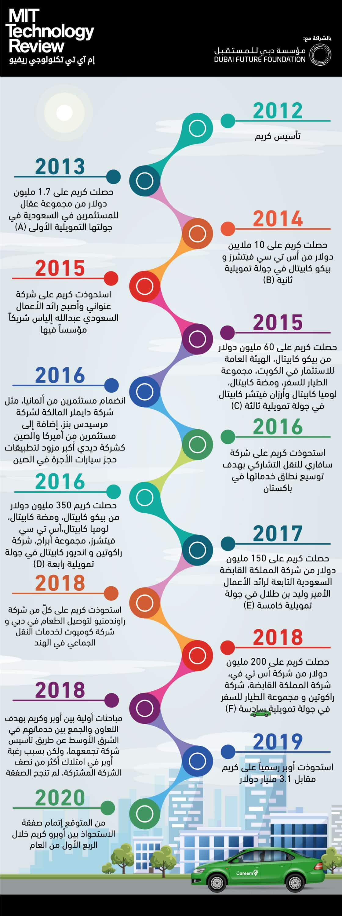 بدأت كريم مشوراها في دبي برأس مال قدره 100 ألف دولار عندما قرر كل من مدثر شيخا وماغنس أولسن ترك عملهما في شركة الاستشارات ماكنزي، بهدف تأسيس مشروع بسيط هدفه حجز المركبات مع سائق خاص، تطوّر كما يوضح الرسم أدناه ليمكن مستخدميه مستخدميه من رصد و تتبع مكان المركبة بشكل آلي وآني على الخريطة والدفع بسهولة نقداً أو بواسطة بطاقة الائتمان. ودخلت في مراحل تمويل متعددة كان آخرها في أكتوبر 2018، عندما قيّمت الشركة بـ 2 مليار دولار. ما يعني زيادة قيمتها بحوالي 50% خلال خمسة أشهر فقط.