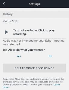 لكن عملية التنقل بين هذه التسجيلات تبدو محبطة جداً؛ فرغم أنه يمكنك التنقل بين تسجيلات التقطها الجهاز على مدار شهور، إلا أنه بعد تحديد أحدها والاستماع إليه، ينقلك الضغط على زر "Back" (رجوع) إلى أعلى القائمة مرة أخرى. إن حذف المئات من التسجيلات العارضة واحدة تلو الأخرى بهذه الطريقة قد يستغرق مني وقتًا طويلاً جدًا. يمكنني حذف كل شيء، بما في ذلك التسجيلات التي طلبتها، دفعة واحدة، ولكن أمازون تحذر من أن هذا سيجعل أليكسا تعمل بجودة أقل، لذا بالطبع من المستبعد أن أفعل ذلك.