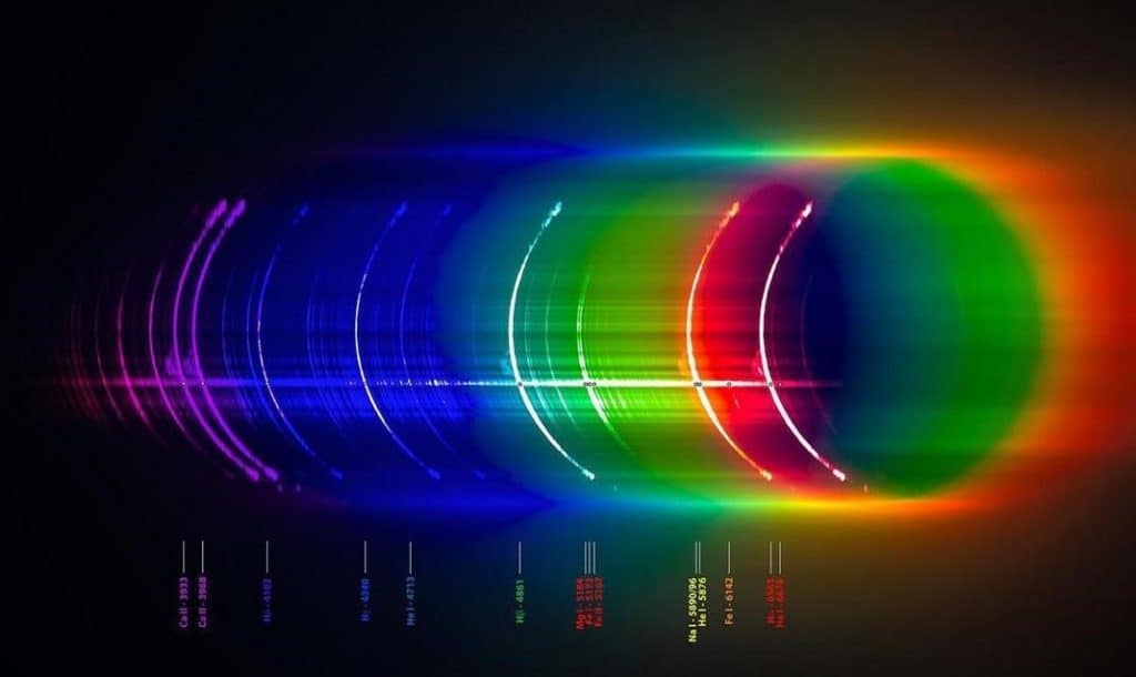تبيِّن هذه الصورة طيف الوهج للغلاف اللوني للشمس، وهو الطبقة الثانية من الأعلى للغلاف الجوي لها، وذلك خلال فترة الكسوف الكلي (في 21 أغسطس 2017) فوق أوريجون. كما تبين الصورة الكسوفَ عند كل طول موجي تصدره ذرات الغلاف اللوني. وعلى سبيل المثال، تصدر ذرات الهيدروجين الضوء في الطول الموجي "هيدروجين ألفا" الموافق للون الأحمر في اليمين، في حين تصدر ذرات الكالسيوم الضوء البنفسجي في اليسار (ريتشارد بيري/ مرصد مروج الألباكا).