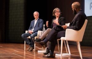 شيرلين إيفل (صندوق الدفاع القانوني للجمعية الوطنية للنهوض بالملوّنين)، تيمنيت جيبرو (جوجل)، ونيكول أوزر (الاتحاد الأميركي للحريات المدنية) في جلسة حوارية خلال ندوة الذكاء الاصطناعي الآن للعام 2018.