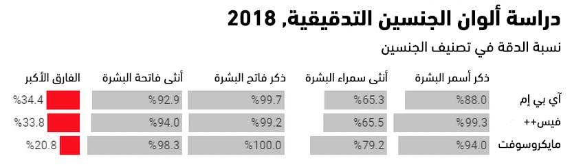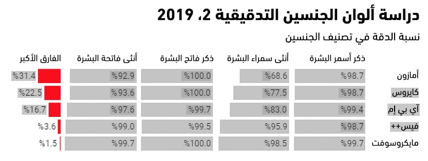 ولكن من الناحية العملية، أظهرت الأبحاث، وبشكل متكرر، أن هذه الأنظمة تتعامل مع بعض المجموعات الديموغرافية بشكل أقل دقة من غيرها. ففي السنة الماضية، وجدت دراسة باسم "ألوان الجنسين"، وهي دراسة مؤثرة أجرتها الباحثة جوي بولامويني من مختبر الميديا في إم آي تي أن أنظمة تصنيف الجنسين، التي تبيعها شركات آي بي إم ومايكروسوفت وفيس بلس بلس، تعاني من نسبة خطأ أعلى بمقدار 34.4% بالنسبة للإناث سمراوات البشرة بالمقارنة مع الذكور من ذوي البشرة الفاتحة، كما وجد الاتحاد الأميركي للحريات المدنية في كاليفورنيا الشمالية، وبشكل مشابه، أن منصة أمازون كانت تخطئ في تحديد أعضاء الكونجرس من ذوي البشرة غير البيضاء أكثر من أقرانهم بيض البشرة.