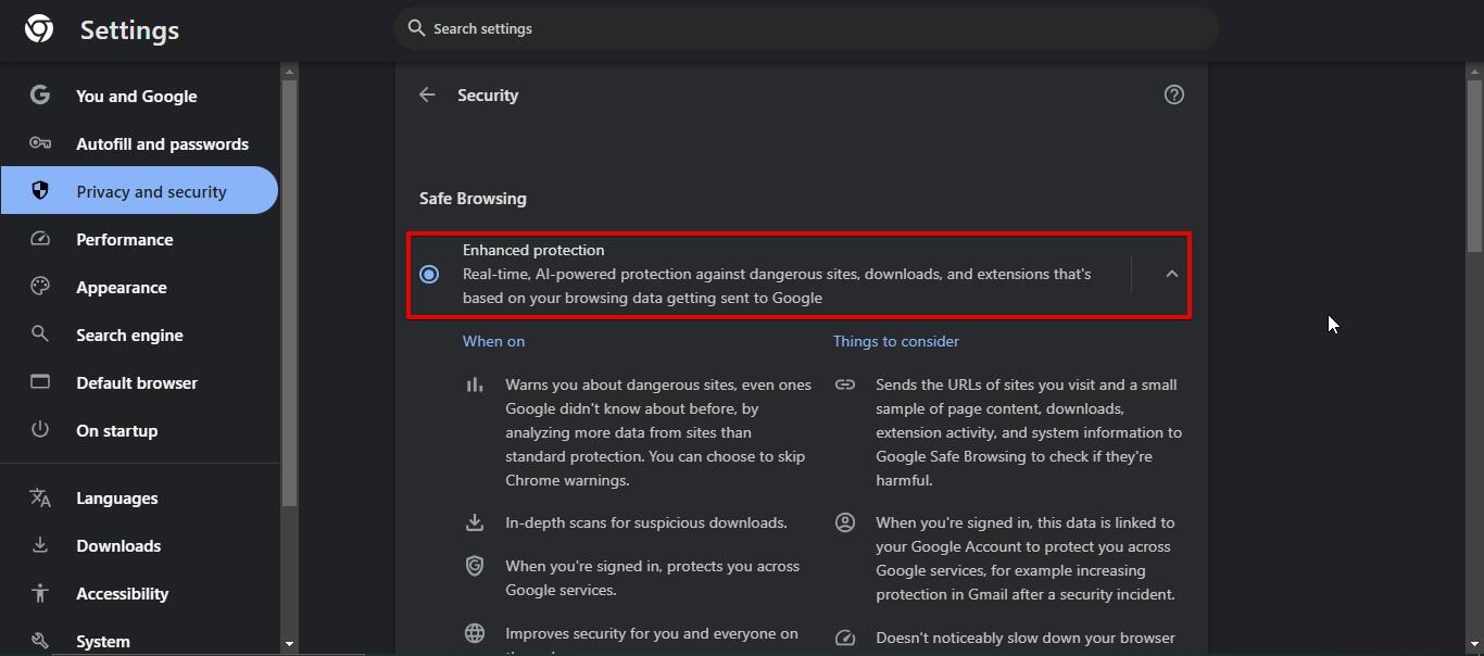 على عكس ميزة حماية التصفح القياسية، يُجري وضع الحماية المحسنة فحوصاً في الوقت الفعلي على عناوين الويب والتنزيلات وملحقات المتصفح، ما يعني أنه إذا حاول المستخدم الوصول إلى موقع ضار محتمل، سيُقيّم المتصفح تلقائياً المخاطر وينبّه المستخدم.