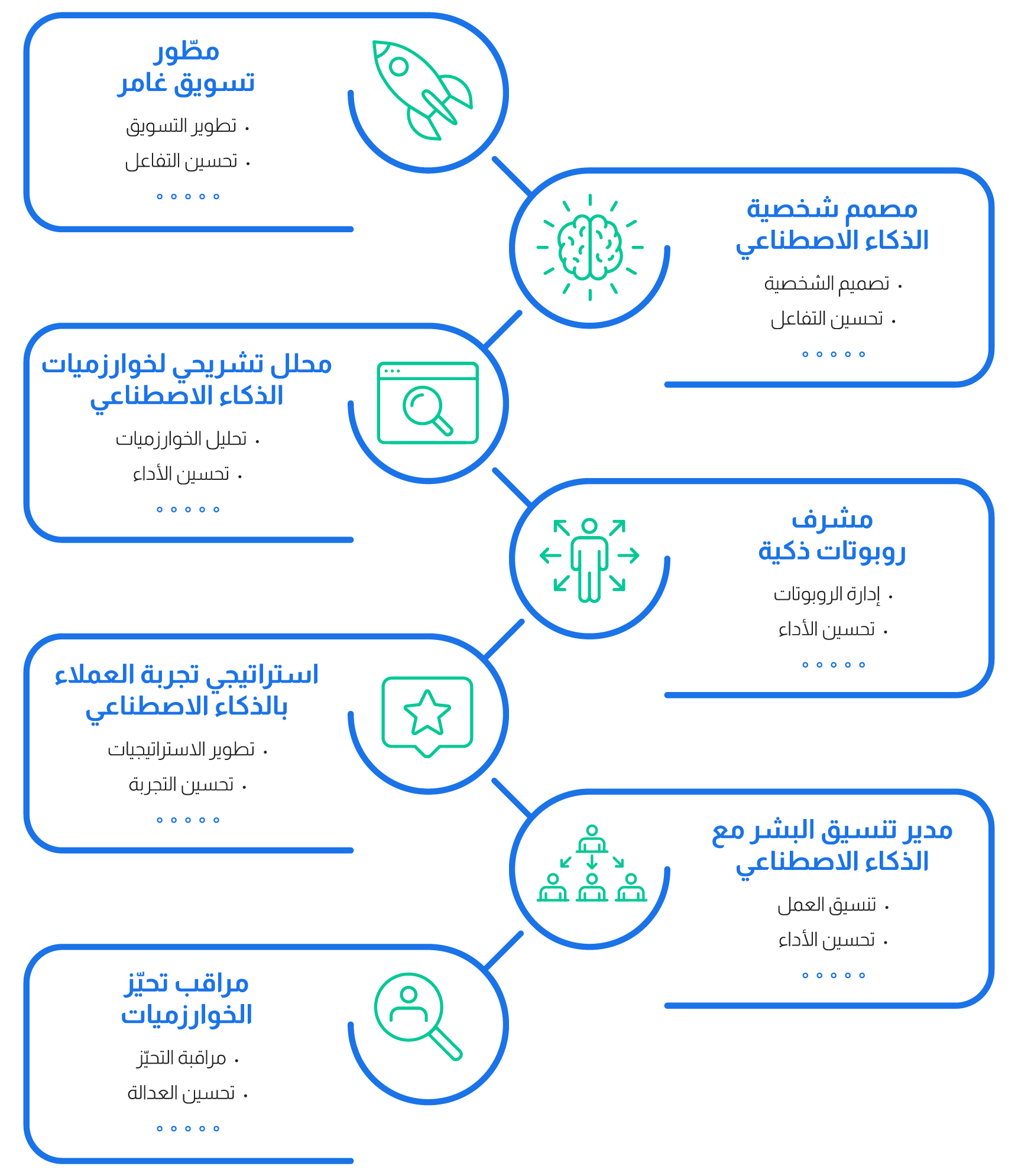 - خبير استراتيجي في تجربة العملاء بالذكاء الاصطناعي (AI Customer Experience Strategist): يطوّر تجربة العملاء بتكنولوجيات الذكاء الاصطناعي.