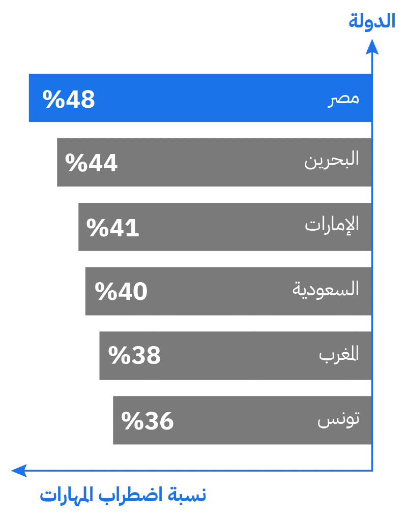 تواجه المنطقة العربية نسبة عالية في مقياس "اضطراب المهارات" بحسب تقرير مستقبل الوظائف الصادر عن المنتدى الاقتصادي العالمي لعام 2025. ويعني اضطراب المهارات تغيّر نسبة كبيرة من المهارات المطلوبة في سوق العمل، وحصول خلل بين مهارات القوى العاملة الحالية والمهارات التي تطلبها الشركات، إذ تحتل مصر المركز الأعلى عربياً وعالمياً في هذا المقياس بنسبة 48%، تليها البحرين (44%)، والإمارات (41%)، والسعودية (40%)، ثم المغرب (38%) وتونس (36%).