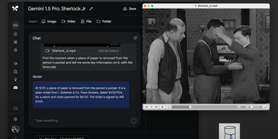 في عرض تجريبي آخر، لقم الفريق نظام الذكاء الاصطناعي بفيلم صامت بطول 44 دقيقة من بطولة باستر كيتون، وطلبوا من النظام تحديد المعلومات المكتوبة على قطعة من الورق كانت في جيب إحدى الشخصيات في إحدى مراحل الفيلم، وأُخرِجت منه لاحقاً. خلال أقل من دقيقة، وجد النموذج الملف المطلوب، واستذكر النص المكتوب على الورقة من دون أخطاء. كرر الباحثون مهمة مماثلة أيضاً من تجربة بعثة أبولو؛ حيث طلبوا من النموذج أن يعثر على مشهد في الفيلم بناء على رسم، وقد أنجز المهمة بالكامل.