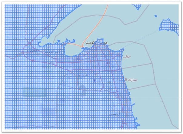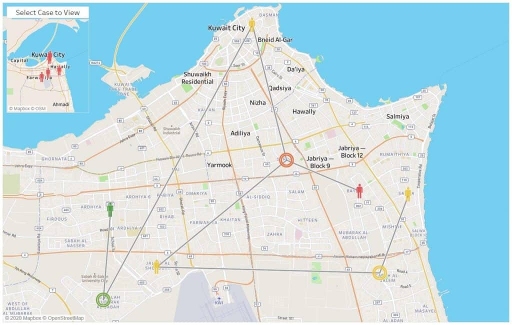 ولا يقتصر نظام تعيين مستوى الخطورة على الأشخاص وإنما يشمل المناطق أيضاً؛ حيث يتم تقسيم الكويت إلى مربعات كل منها بمساحة 1 كيلومتر مربع. ويتم تعيين درجة خطورة كل مربع بناء على عدد حالات الإصابة المؤكدة بكوفيد-19 ونسبة التنقل والكثافة السكانية في المربع.