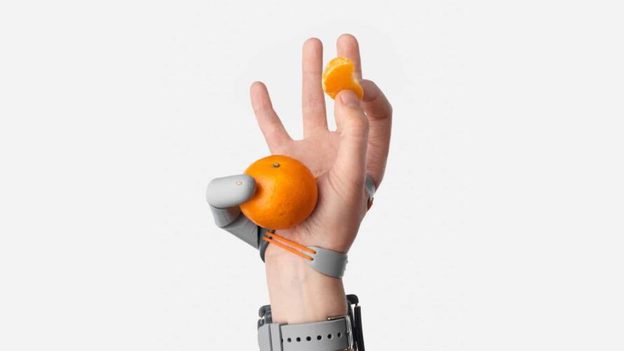 أما مشروع كلود الحالي، والذي يساعدها أيضاً في إنجاز عملها، فهو إبهام ثالث يمكن لأي شخص استخدامه لتعزيز قبضة يده. ويعمل هذا الجهاز بالمحركات، ويتم التحكم فيه باستخدام مستشعرات ضغط ضمن حذاء المستخدم. وقد تعلم بعض المتطوعين كيفية استخدامه لفتح زجاجة، وشرب الشاي، بل وحتى العزف على الغيتار. وتأمل كلود أن هذا الإبهام (والأجهزة المماثلة) سيكون عاملاً مساعداً في رفع فعالية العمل لدى الجميع وتخفيف العمل على أجسادهم، بدءاً من عمال المصانع وصولاً إلى الجراحين.