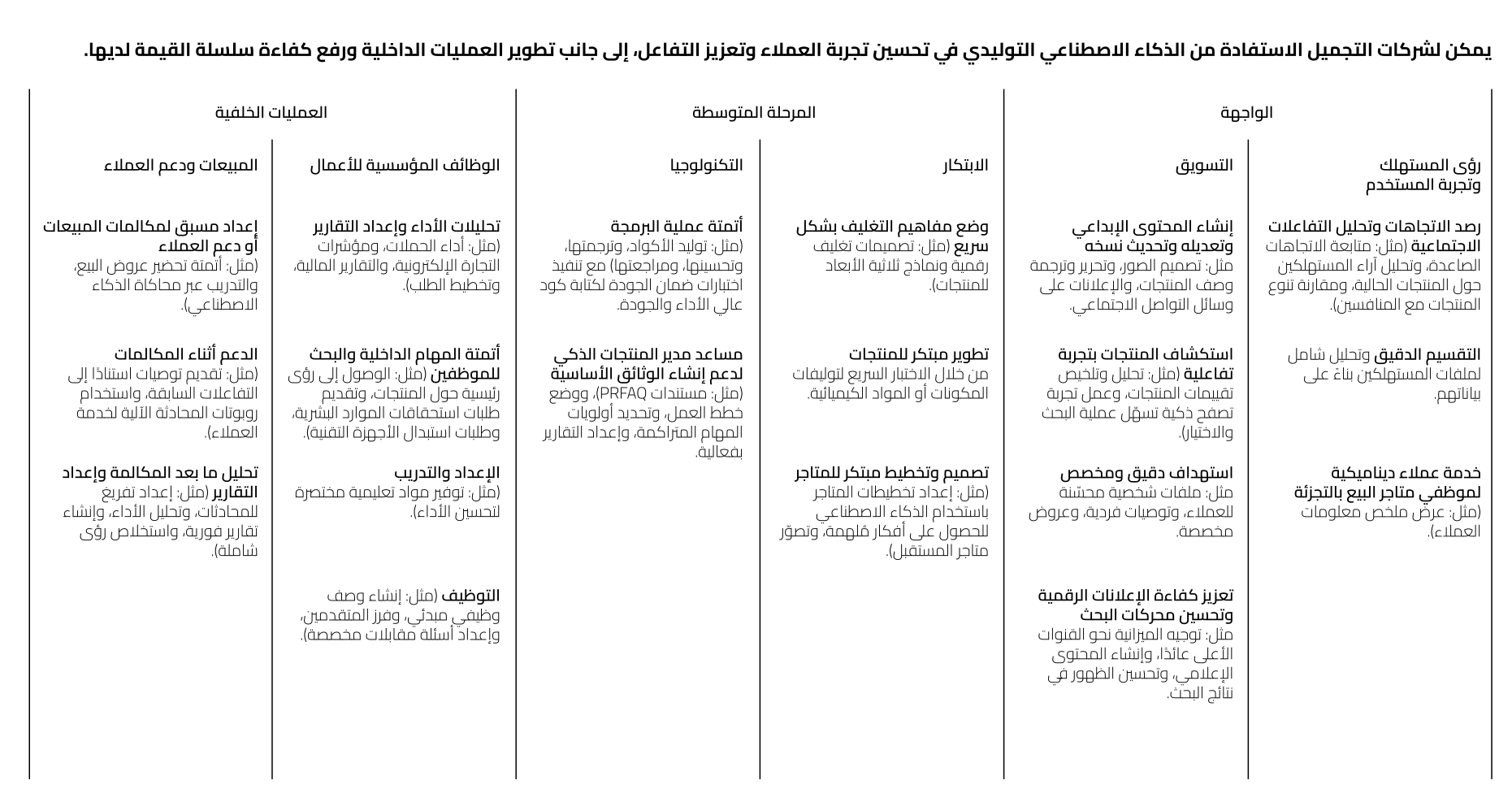 هناك أكثر من عشر حالات استخدام للذكاء الاصطناعي التوليدي أثبتت نجاحها في قطاع المستهلك بشكلٍ عام، والتي يمكن تبنيها بفاعلية في صناعة التجميل. تمتد هذه الاستخدامات لتشمل مختلف جوانب العمل داخل المؤسسة، بدءاً من مهام تحسين تجربة المستخدم من خلال تقديم توصيات مخصصة ومحتوى مبتكر، إلى تعزيز كفاءة خدمات دعم العملاء عبر حلول ذكية تُلبي احتياجاتهم بسرعة ودقة.