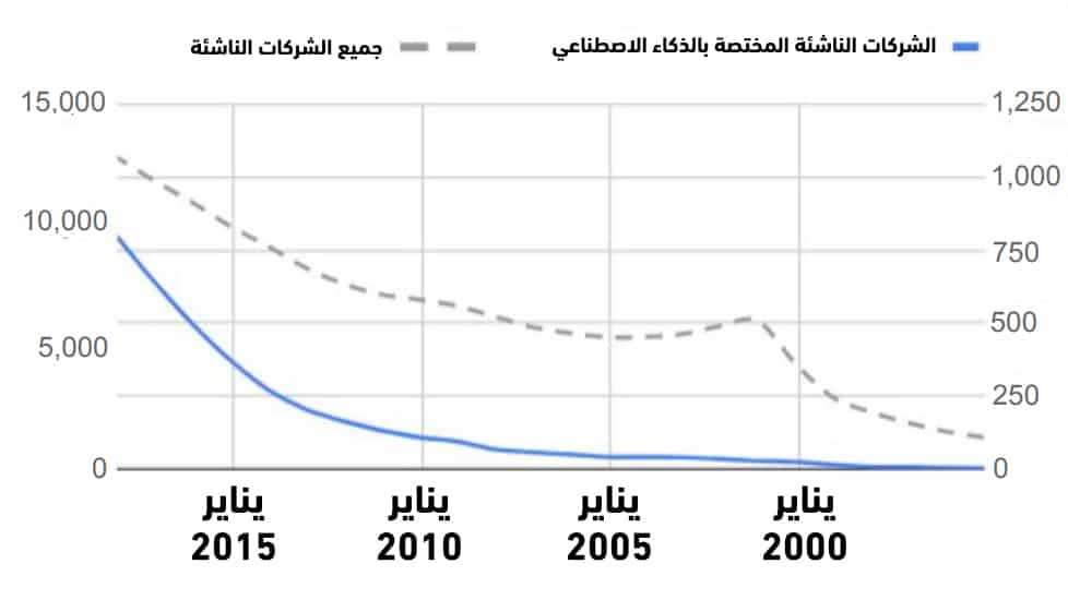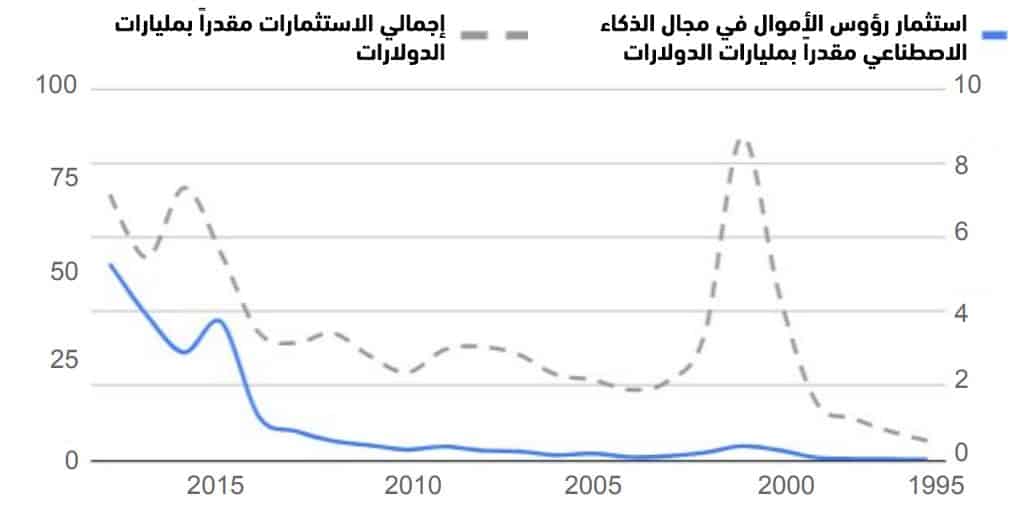 وصلت كمية الأموال التي يتم إنفاقها على الذكاء الاصطناعي إلى مستويات كبيرة للغاية. ويظهر في هذا الشكل البياني العلوي عدد الشركات الناشئة المختصة بالذكاء الاصطناعي على اليمين، مقارنة مع إجمالي الشركات الناشئة على اليسار. أما الشكل البياني السفلي فيبين الاستثمار في مجال الذكاء الاصطناعي على اليمين مقارنة بإجمالي الاستثمارات على اليسار. وهو ما يعبر عن الفرص الضخمة في استخدام التعلم الآلي في صناعات مختلفة، وأسواق تحظى بالكثير من الدعاية وتعج بالحركة والنشاط.
