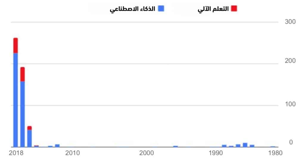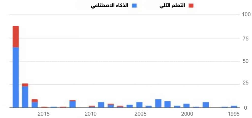 تزايد عدد المرات التي ذكر فيها الذكاء الاصطناعي والتعلم الآلي في الكونجرس الأميركي (في الأعلى) والبرلمان البريطاني (في الأسفل) بشكل كبير في السنوات الأخيرة، مما يعكس تزايد الوعي حول الأهمية الاقتصادية والإستراتيجية لهذه التكنولوجيا (انظر مقالة "كندا وفرنسا تخططان لتأسيس لجنة دولية لتقييم أخطار الذكاء الاصطناعي").