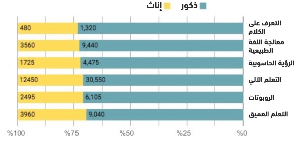 أشار الكثير من الباحثين إلى ضعف تمثيل النساء والأقليات في أبحاث الذكاء الاصطناعي، ويقدم هذا التقرير الجديد بعض البيانات لدعم وجهة النظر هذه، مُظهراً نقصاً كبيراً للنساء في صفوف المتقدمين لوظائف الذكاء الاصطناعي (في الشكل العلوي) ونسبتهن في الأدوار التعليمية للذكاء الاصطناعي (في الشكل السفلي).